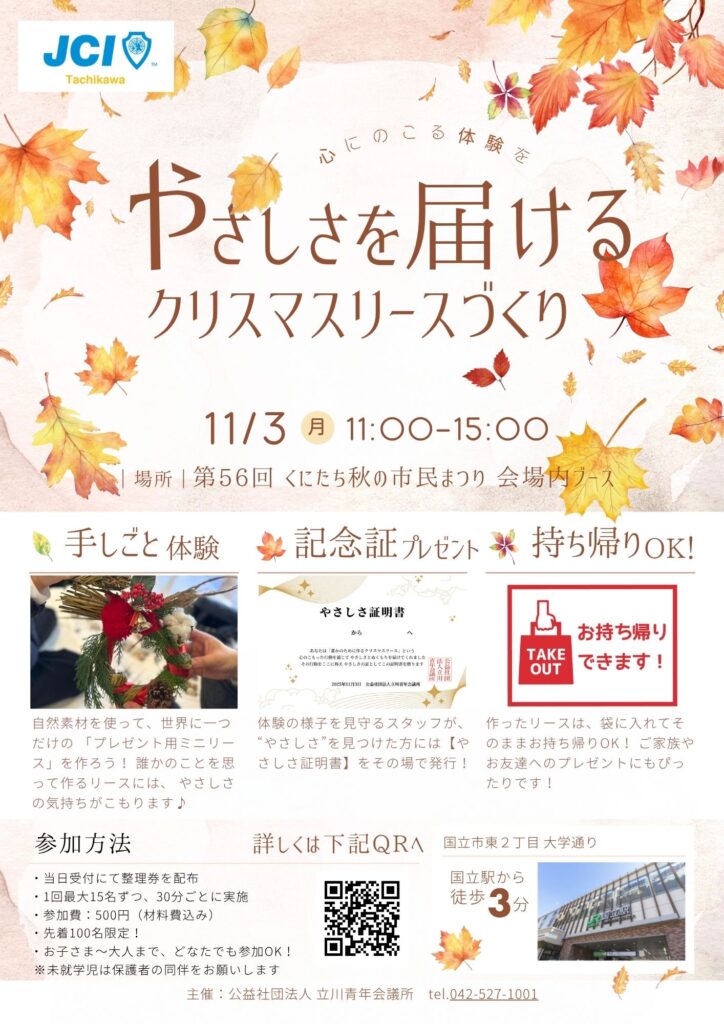 国立市・大学通りで開催される「第56回くにたち秋の市民まつり」では、親子で楽しめる人気ワークショップ「クリスマスリース作り体験」を実施いたします。自然素材を使ったリースづくりは、手のぬくもりを感じながら秋の季節を味わえる体験です。お子さんと一緒に手を動かして、自分だけのオリジナルリースを作ってみませんか。