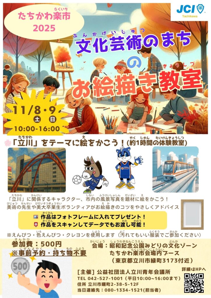 11月8日(土)、9日(日)に国営昭和記念公園みどりの文化ゾーンで行われる「たちかわ楽市」会場内で『文化芸術のまちのお絵描き教室』を開催いたします。