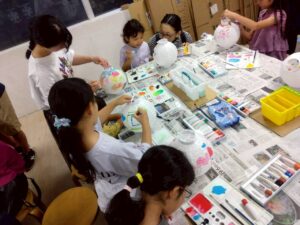 絵付け会場内の子供たちと保護者の方たち、多くの笑顔あふれる体験事業となりました。
